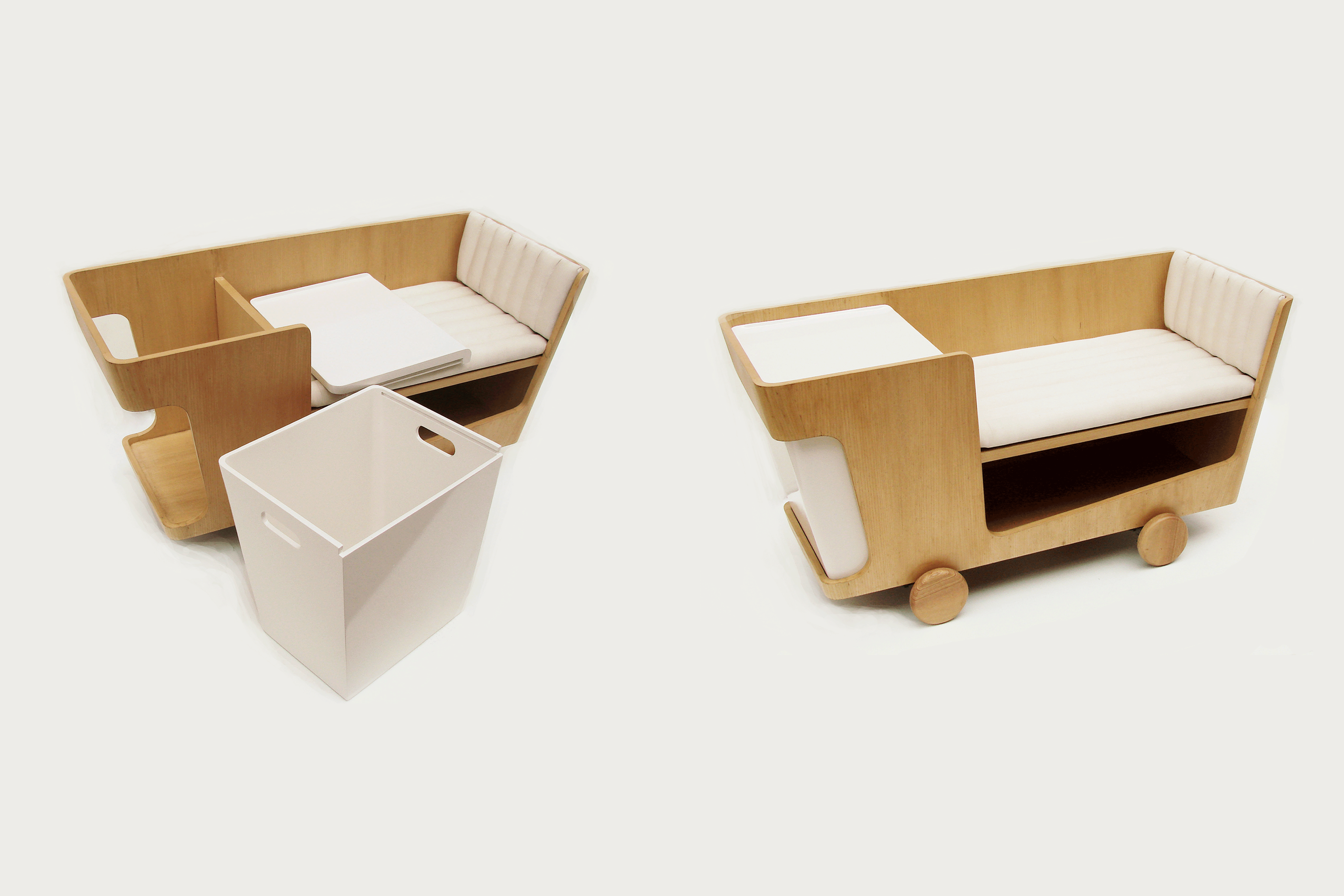 The furniture piece has a storage space, a removable toy bin, whose lid also acts as a writing surface, and a seat making it a personalised piece of furniture addressing a child’s basic daily activities of sitting, playing and studying.